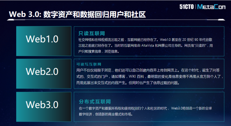 对于Web3.0,根据行业和立场的不同,大家可能有不同的定义。而在在区块链或者元宇宙行业,我们更多是希望把Web3.0定义为一个数字资产以及数据回归个人和社区的时代。当用户不希望共享数据时,有权利通过私钥来保证自己的数据所有权和使用权。