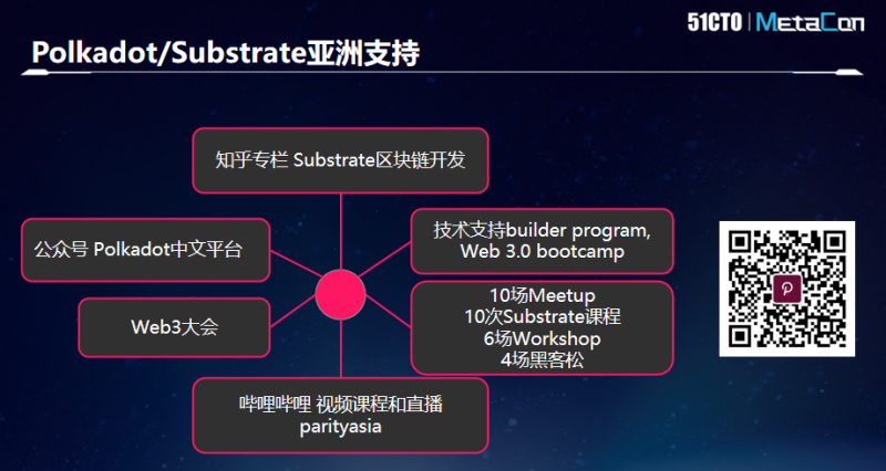 与此同时,Parity本身也在亚洲特别是国内开展了各种各样的活动,包括面向开发者的课程,面向初创团队的服务,跟万向区块链合作组织的Web3.0训练营。