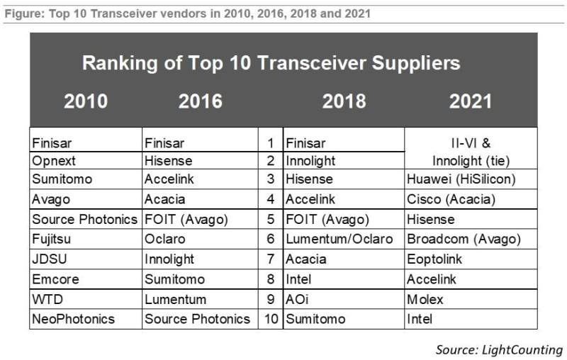 2021年,旭创科技与II-VI(收购了光模块龙头Finisar)并列第1名(2020年排名第2),华为(海思)排名第3(2020年排名第3),Hisense海信宽带排名第5(2020年排名第4),Eoptolink新易盛排名第7(2020年排名第9),Accelink光迅科技排名第8(2020年排名第8)。