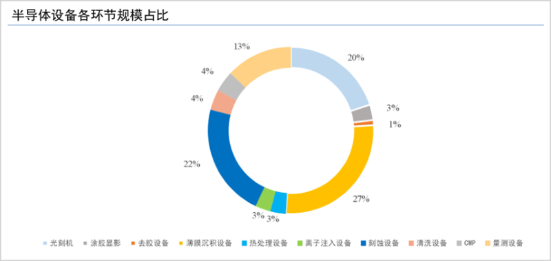 细分来看,半导体制造设备主要包括薄膜沉积设备、刻蚀设备、光刻机、清洗设备、CMP、离子注入设备、热处理设备、涂胶显影等。其中薄膜沉积、刻蚀和光刻环节的价值量占比最高,分别达到了27%、22%和20%。