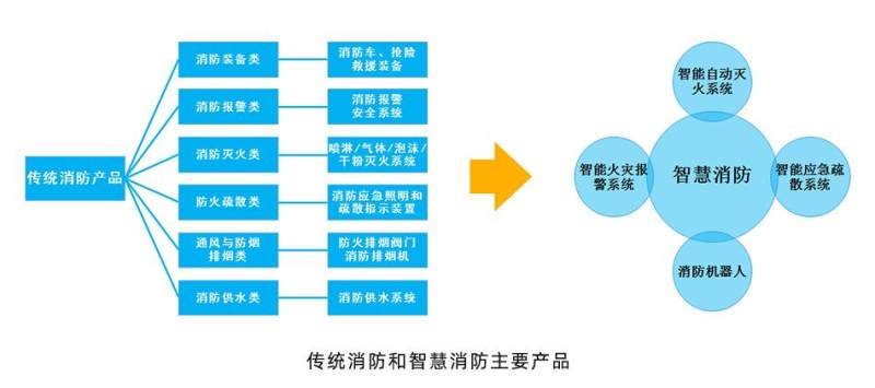 传统消防行业消防产品主要包含消防设备、火灾报警设备、灭火系统、供水系统、灭火器等;智慧消防通过搭建智慧消防平台,连接各类传统消防产品,包含智能自动灭火系统、智能应急疏散系统、智能火灾报警系统、消防机器人等。