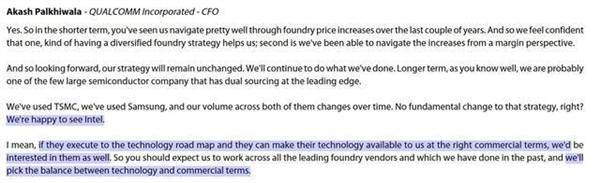 高通CFO Akash Palkhiwala近日在摩根大通JPM大会上表示,高通未来会采用多元化代工策略,如果Intel的技术路线图执行顺利,并且能够提供恰当的合作条件,高通会与其进行合作。