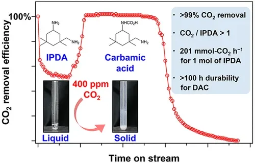 新的化合物属于最后一类,它们被称为液-固相分离系统。在研究一系列液态胺化合物时,东京都立大学的研究团队发现其中一种名为异佛尔酮二胺(IPDA)的化合物在捕捉二氧化碳方面特别有效。