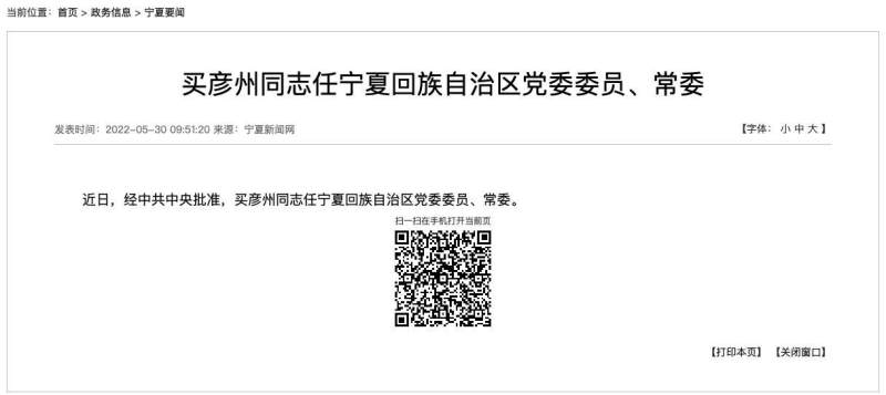 C114讯 5月30日消息(林想)据宁夏自治区政府网消息,近日,经中共中央批准,买彦州同志任宁夏回族自治区党委委员、常委。