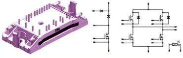 应用中,为尽可能地降低开关器件的损耗,PWM(脉宽调制)控制策略使上桥臂开关管频率设定为电网频率(例如50hz),而下桥臂开关管则工作在较高的开关频率下,来实现输出正弦波。这样的工作模式对全桥逆变中上下开关管的性能要求不同,上桥臂应用工况与Si IGBT匹配,下桥臂应用工况与SiC MOSFET匹配。典型模块及电路拓扑如下所示。