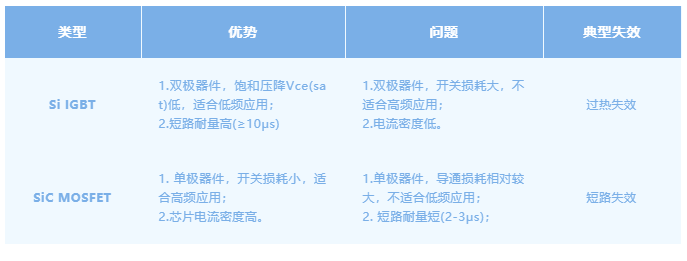 Si IGBT与SiC MOSFET的特性如下表所示。