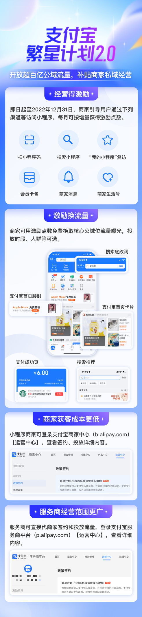 5月30日,据支付宝开放平台官方消息,为了进一步帮助商家降本增效,支付宝将开启“繁星计划2.0”,未来半年面向商家补贴超过百亿的公域流量,并向服务商开放流量代运营能力,全力支持商家私域数字化经营。