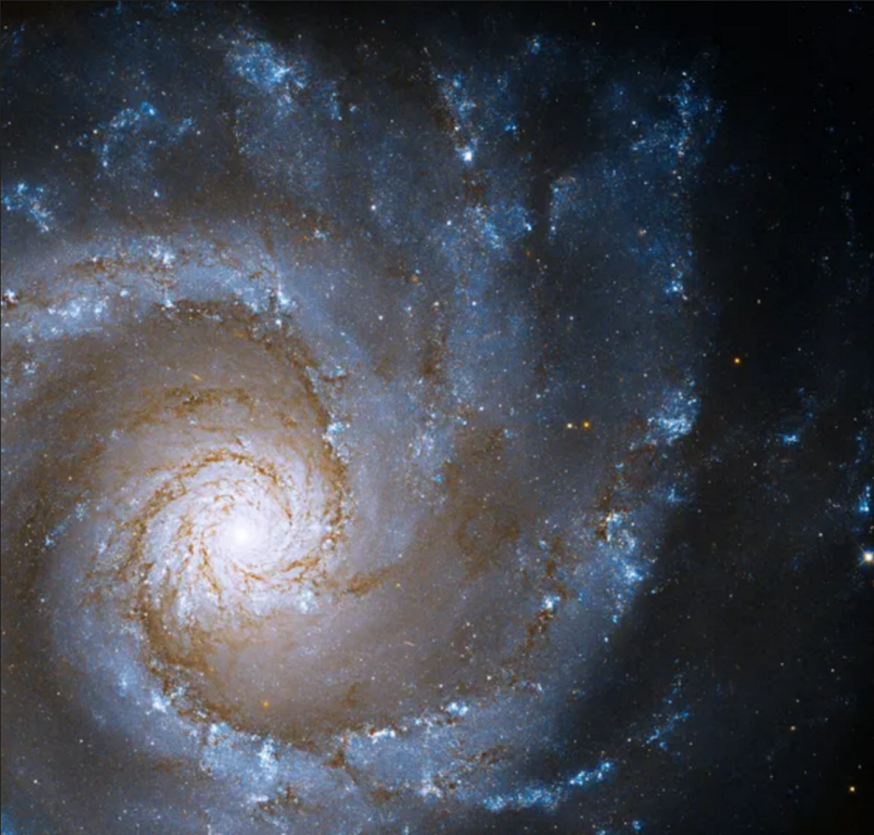 仔细检查NGC 3631的大旋臂可以发现沿旋臂内部的暗色尘埃通道和明亮的恒星形成区域。螺旋体中的星体形成类似于州际公路上的交通堵塞。就像高速公路上的汽车一样,螺旋体盘中移动较慢的物质形成了一个瓶颈,其将形成恒星的气体和尘埃集中在其旋臂的内部部分。这种交通堵塞的物质会变得如此密集,以至于它在引力作用下坍缩进而形成新的恒星(这里看到的是明亮的蓝白色)。