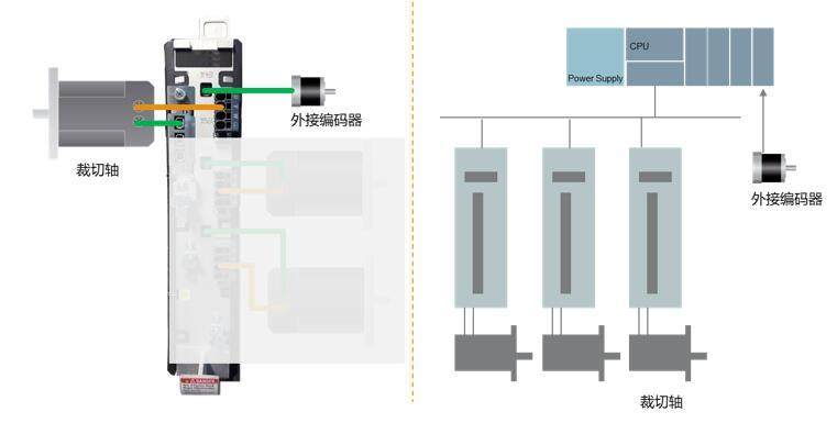 在传统的伺服电子凸轮裁切中,需要裁切轴跟随外接的测量材料速度的编码器,PLC+运动控制模块的架构往往将编码器接入到I/O测。如图8所示,贝加莱的ACOPOS系列则直接接入到伺服驱动器的插槽中,这样直接的计算就会获得更快的响应能力,确保裁切的精度。