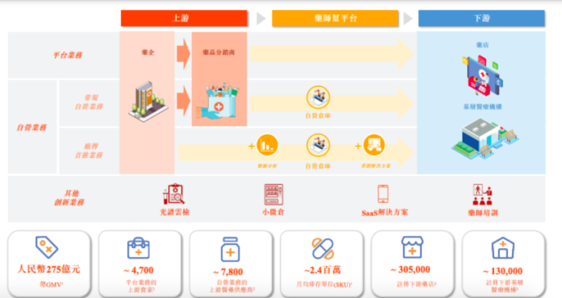 招股书显示,药师帮的业务模式以平台业务及自营业务为中心,并佐以一系列其他创新业务。根据弗若斯特沙利文的资料,公司的总GMV于2021年达到人民币275亿元。