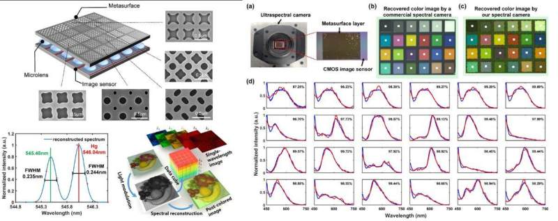 该成果研制的国际首款实时超光谱成像芯片如图1所示。通过硅基超表面实现对入射光的频谱域调制,利用CMOS图像传感器完成频谱域到电域的投影测量,再采用压缩感知算法进行光谱重建,并进一步通过超表面的大规模阵列集成实现实时光谱成像。该款实时超光谱成像芯片将单点光谱仪的尺寸缩小到百微米以下,空间分辨率超过15万光谱像素,即在0.5 cm2芯片上集成了15万个微型光谱仪,可快速获得每个像素点的光谱,工作谱宽450~750 nm,分辨率高达0.8nm。