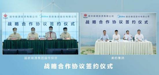 5月31日,美的集团股份有限公司(简称"美的集团")与国家能源集团旗下国华能源投资有限公司(简称"国华投资")签署战略合作协议,双方将聚焦储能系统、光伏、风电等新能源项目及综合能源利用领域,充分利用各自资源与优势展开全面合作,加速推进"绿色零碳园区"的建设与推广。美的集团董事长兼总裁方洪波,美的集团副总裁兼工业技术事业群总裁伏拥军;国华投资党委书记、董事长刘小奇,党委委员、副总经理刘玮出席签约仪式。此次签约以云签约形式进行。