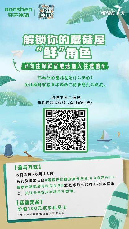 初夏的风轻轻摇晃着门前的贝壳风铃,蘑菇屋家人坐在椅子上喝茶聊天,享受着阳光、海浪、沙滩的美好,这就是《向往的生活》第六季的美好画面。相信成为这个画面中的某一名成员是好多粉丝的梦想吧。今天“向往探鲜官”容声WILL健康冰箱将带你解锁蘑菇屋的“鲜”角色,只要你扫描二维码,就可以一步步揭开你在蘑菇屋的“身份”了。另外,如果转发微博带话题#解锁你的蘑菇屋鲜角色##容声WILL健康冰箱探鲜向往的生活#还有机会获得大奖呦。