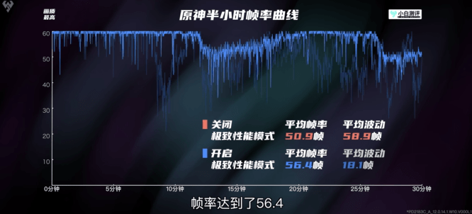而在最高画质的《原神》中,vivo X80在开启极致性能模式下平均帧率可以达到56.4帧,这个表现也是可圈可点的优秀。