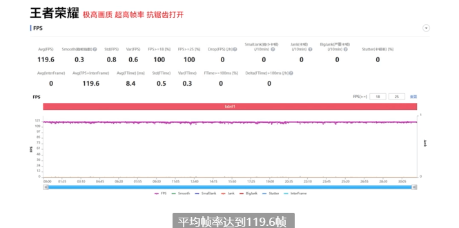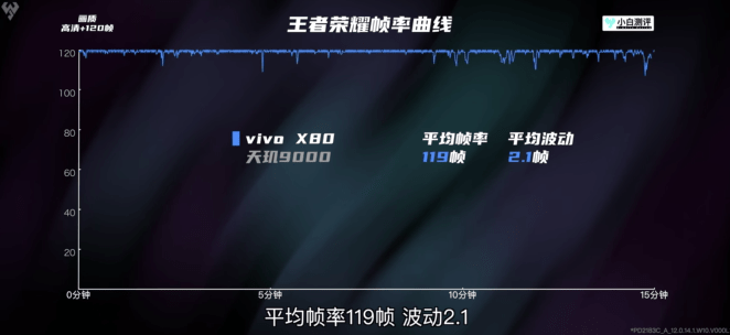 天玑8000系列芯片在实测中的表现也十分出色,以次旗舰性能榜排名第一的vivo S15 Pro为例,这款新机搭载了天玑8100。媒体测试成绩显示,《王者荣耀》开启极高画质、超高分辨率和抗锯齿进行30分钟游戏后,vivo S15 Pro实现了119.6的满帧成绩,且十分平稳。