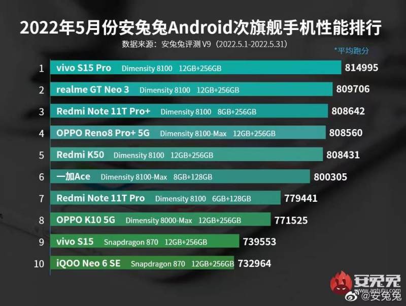在5月安卓次旗舰手机性能榜单中,vivo S15 Pro、realme GT Neo 3、Redmi Note 11T Pro+、OPPO Reno8 Pro+、Redmi K50、一加Ace、Redmi Note11T Pro、OPPO K10这八款搭载天玑8000系列芯片的手机性能包揽榜单前八,天玑8000系列芯片成功“屠榜”。