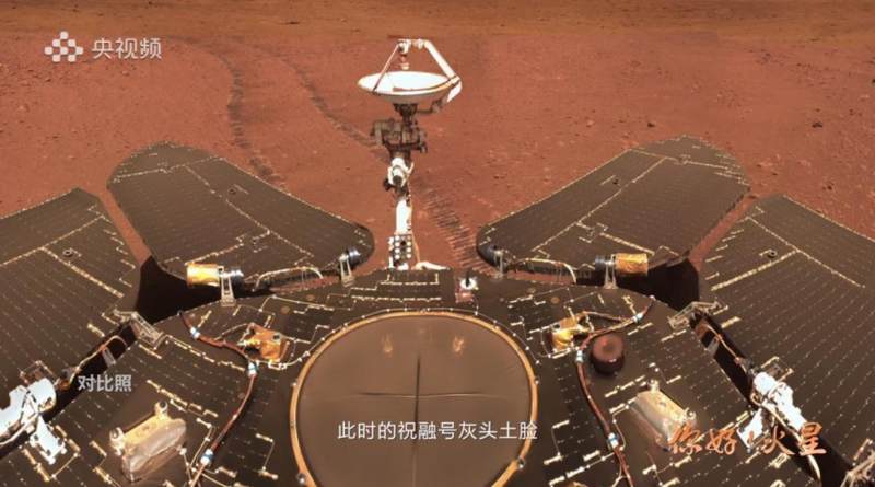 我国首次火星探测任务天问一号探测器首战告捷,它通过一次任务实现火星环绕、着陆和巡视。天问一号探测器于2020年7月23日发射,2021年5月15日着陆巡视器成功着陆于火星乌托邦平原( Utopia planitia) 南部预定着陆点(109.9°E,25.1°N)。5月22日,祝融号火星车驶离与之陪伴303天的着陆平台,在火星大地上迈出0.522米的第一步。5月26日,火星车拍摄并传回着陆平台的照片,着陆平台上的五星红旗鲜艳夺目,清晰闪耀在火星表面,在火星上留下“中国印迹”。