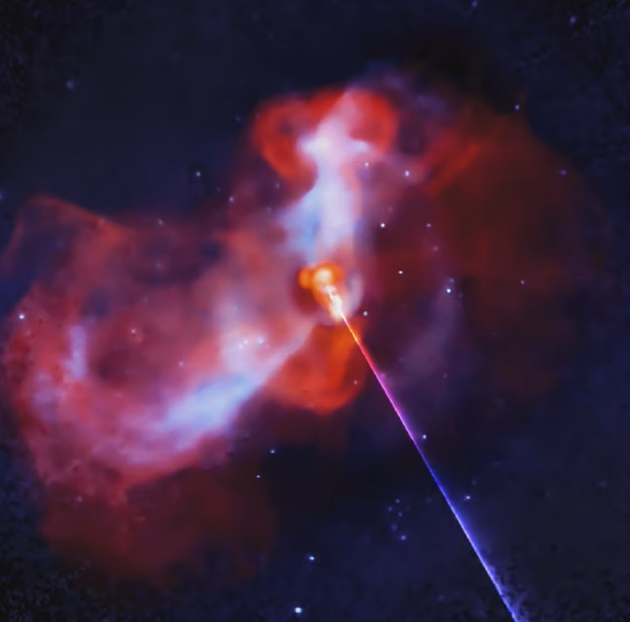 观测数据显示,M87黑洞正在喷射大量高能粒子,这些高能粒子与周围的巨大热气体云相互作用。