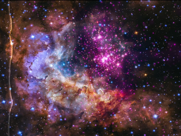 来自哈勃太空望远镜的观测数据(绿色和蓝色部分)揭示了恒星形成的厚密星云,钱德拉X射线探测器拍摄的紫色部分穿透了这片薄雾。