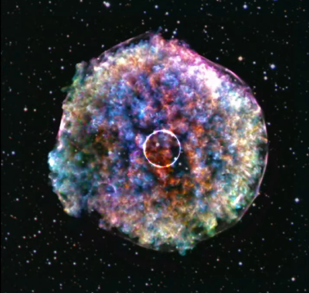 第谷超新星中心区域,声波化超新星残骸呈圆形向外扩散,该视频图像包含着来自钱德拉X射线探测器的数据,其中不同的颜色代表了小频带,这些频带与朝向或者远离地球的不同元素有关。