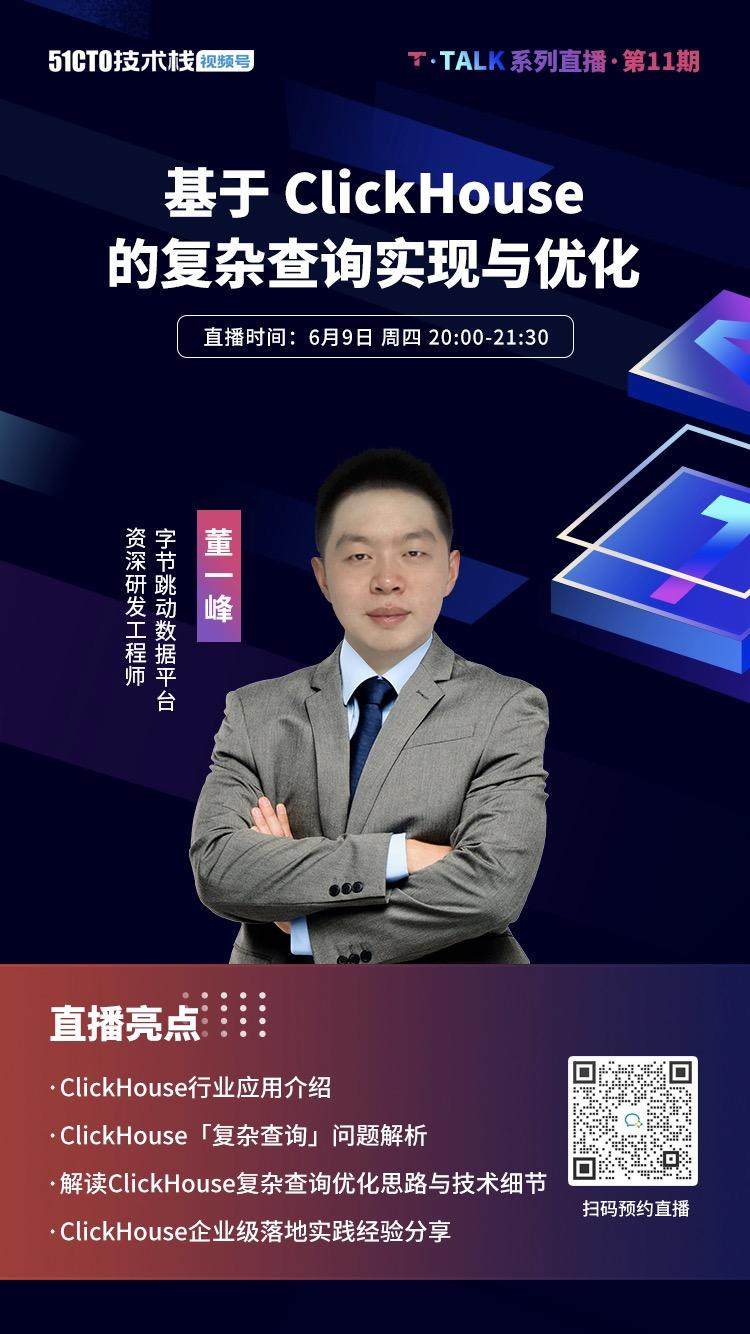 6月9日晚19:30,在【T·TALK】的第11期技术分享活动中,我们特别邀请到了字节跳动数据平台资深研发工程师董一峰老师做客直播间。届时,董一峰老师将通过本期直播,为大家详细解读ClickHouse的「复杂查询」问题,并首次公开分享字节跳动解决ClickHouse复杂查询问题的优化思路与技术细节。感兴趣的同学可扫描海报二维码,提前预约精彩内容。