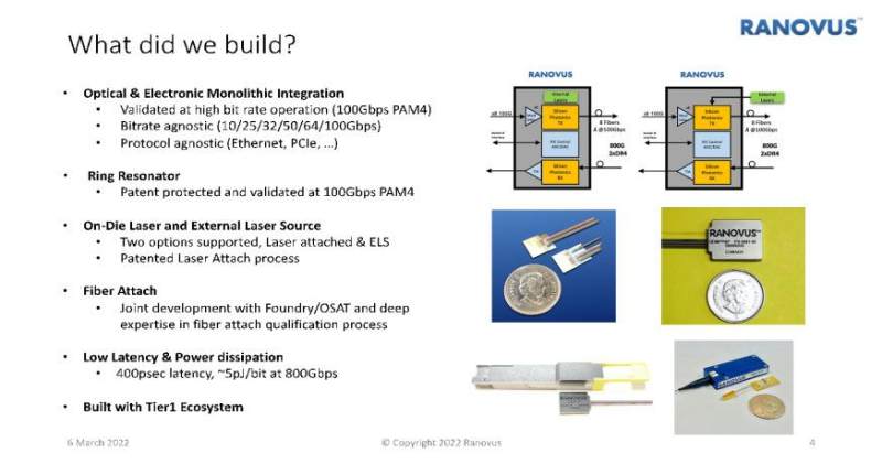 AMD-Xilinx和Ranovus宣布了一项800G解决方案的联合项目,使用AMD-Xilinx的800G SERDES和Ranovus的800G光学引擎。该解决方案针对可插拔模块,但可以很轻松地适应CPO解决方案。Ranovus的光学引擎是目前唯一满足CPO功耗目标的解决方案。