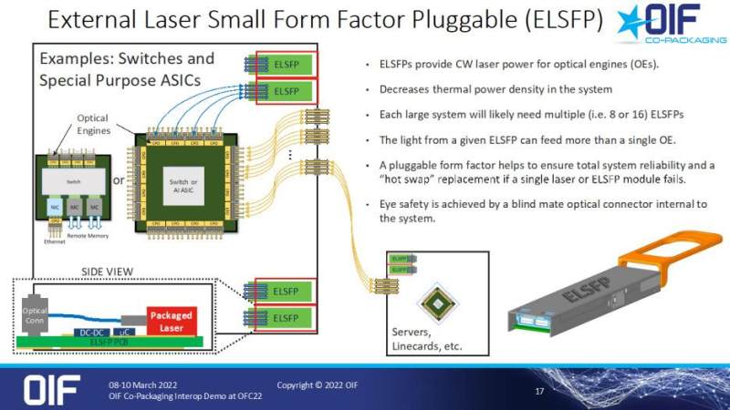 OIF展示了使用外部激光小型可插拔(ELSFP)模块的CPO解决方案。图6显示了设置的意图。