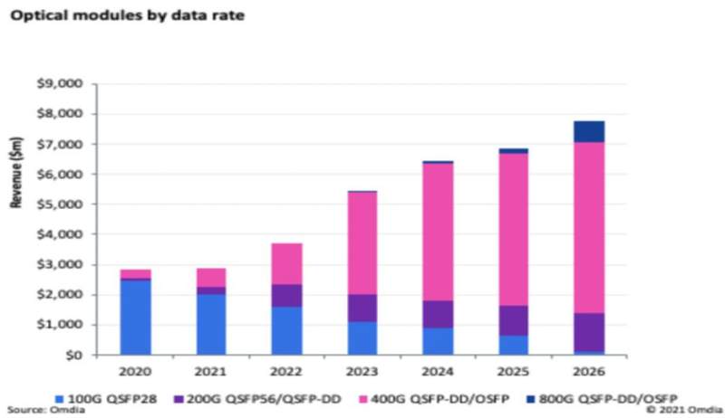 Omdia的市场研究与400G和800G产品的路线图一致,但现在预测1.6T和3.2T将如何展开还为时过早。以下是Omdia对100G及以上的ICP数据中心可插拔光模块的预测。