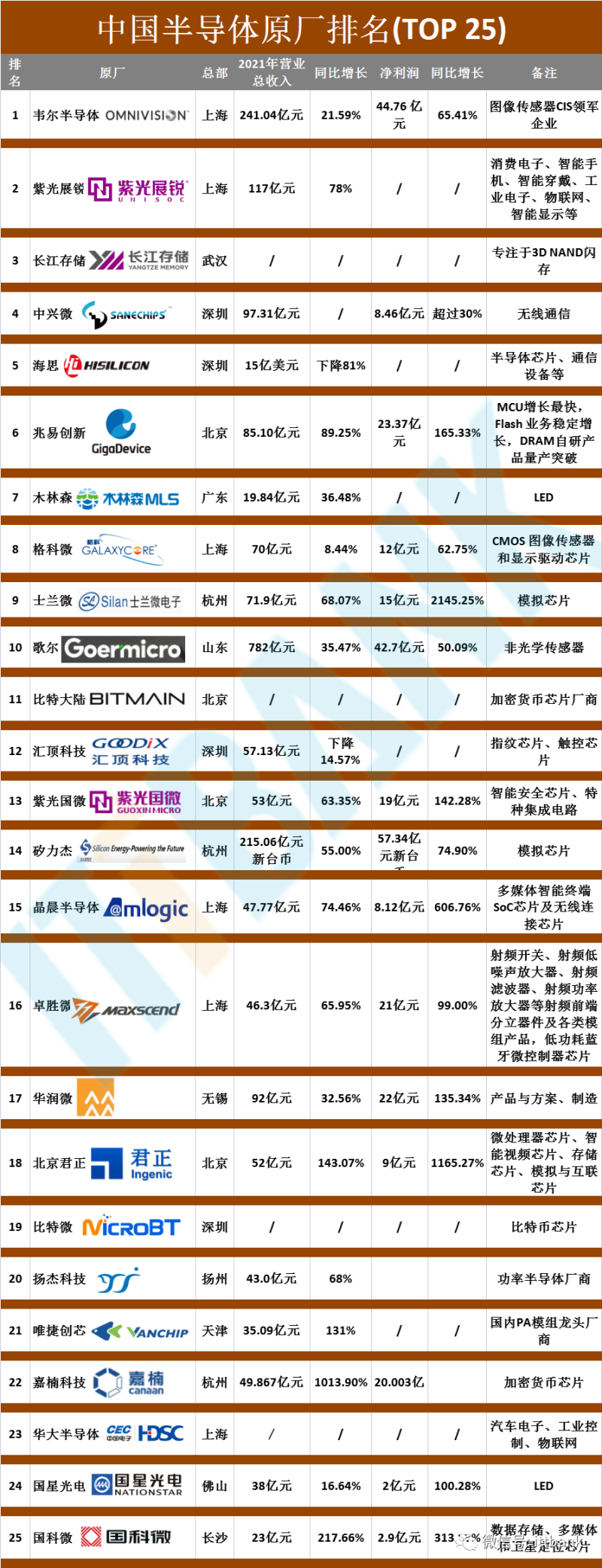 满天芯梳理了中国半导体Top25的企业简介和近期的业绩表现:
