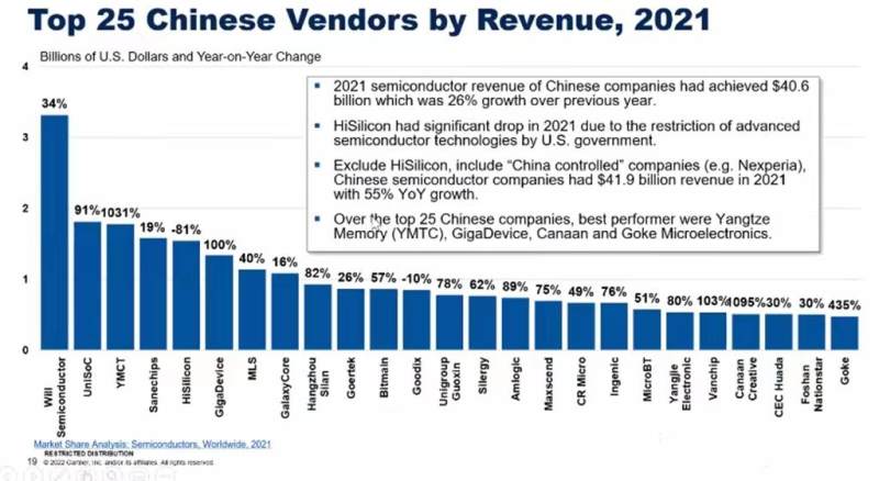 近期,Gartner发布了中国前25名半导体供应商的排名榜,整体来看,前十名的企业营收都已达10亿美元左右,即使是第25名的厂商营收也在5亿美元左右。且大部分厂商都实现了可观的增长,表现较为突出的是长江存储、兆易创新、唯捷创芯、嘉楠和国科微,均实现了三位数的同比营收增长。仅海思和汇顶科技是两家企业营收下降。