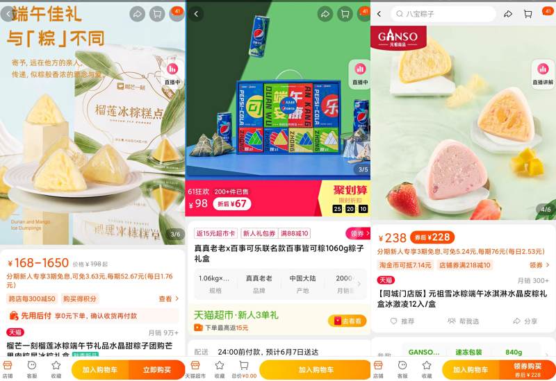 直播、内容种草成为不少企业的销售带货“利器“。端午节的粽子也逐渐演变成年轻人新的“社交货币”。电商平台数据显示,去年五月中旬至端午节,粽子销量环比增长超过300%。“90后”在618期间更是成为粽子消费主力,购买人数和金额双双位居各年龄段首位。