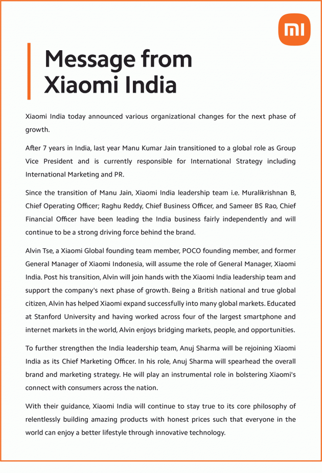 小米印度公司通过推特宣布公司组织调整:马努·库马尔·贾恩(Manu Kumar Jain)去年以集团副总裁的身份转为全球角色,目前负责包括国际营销和公关在内的国际战略;小米印尼公司前总经理谢子阳(Alvin Tse)将担任小米印度公司总经理一职;阿努吉·夏尔马(Anuj Sharma)将重新加入小米印度,担任其首席营销官。
