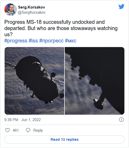 周三,科萨科夫在Twitter上发布了几张货运飞船的照片,该飞船正准备在地球大气层中燃烧。"进步MS-18号成功解锁并离去。但那些偷渡者是谁在看着我们?"科萨科夫写道。