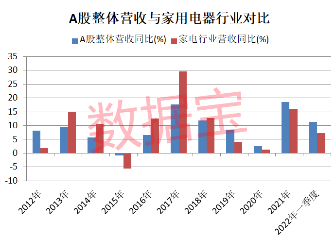 家电下乡对相关上市公司带来的业绩刺激显而易见。数据宝统计显示,第一轮家电下乡实施后的2009年至2014年期间,A股家用电器行业营收和净利润均保持增长状态,其中行业净利润增速连续六年高于同期A股整体水平。近七年中除2015年、2018年家电行业净利润经历短暂下滑外,一直都是增长状态。