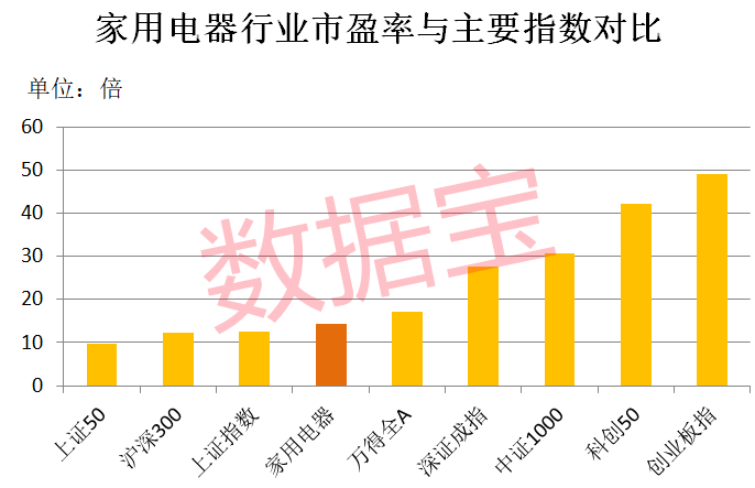 数据宝统计,截至目前,家用电器行业市盈率14.38倍,处于五年来低点区间,不及五年来分位点的两成;行业市净率2.49倍,同样为五年来低点区间,不足分位点的一成。与大盘指数对比,家用电器行业市盈率仅深证成指、中证1000的五成左右,不到创业板指市盈率的三成。两大家电巨头美的集团、格力电器市盈率均低于行业水平。