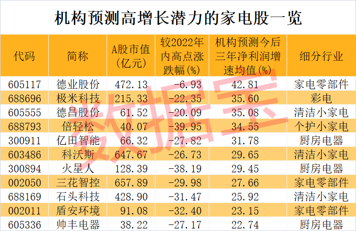 综合来看,业内表示,在原材料下跌+低估值+基本面复苏的背景下,家电板块接下来几个月的表现值得期待。哪些家电股今后三年具备增长潜力呢?机构一致预测数据或能提供一定参考。数据宝统计,30只家电股被5份以上券商研报覆盖,其中11股获机构预测今后三年净利润增速均超20%。