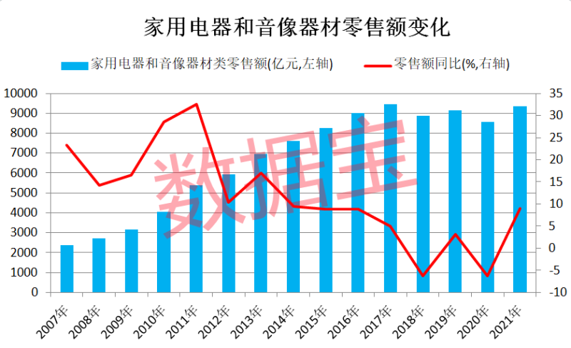 在消费政策的刺激下社会消费品零售额增速回升,家电产销量期间明显上升。2009年3月后家用电器和音像设备器材类零售额累计同比止住了下滑趋势,并于2010年2月达到历史新高的31%。但随着政策效应递减,经历一年修复周期后增速方才回归平稳增长。
