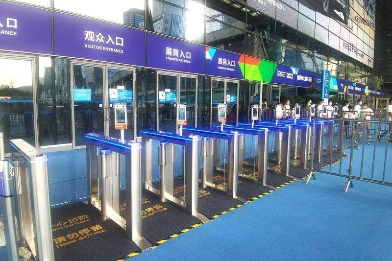 当我们来到福田会展中心,走到入口处,映入眼帘的是成排的面部签到闸机。通过自助闸机时,你只要拿出身份证一刷,即可完成无接触式签到,实现迅速签到、高效入场,确保防疫与参展两不误。