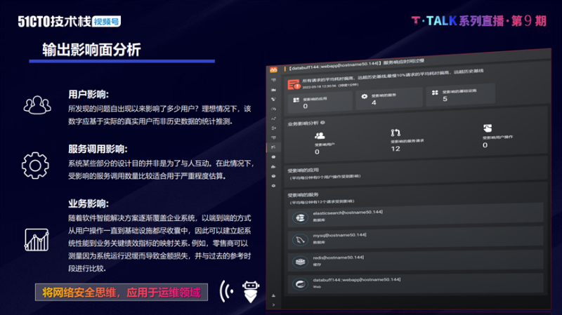 输出影响面分析则相当于网络安全的思维,在运维当中也是一样。系统出现了故障或异常,其影响面有哪些,会影响哪些用户、会影响哪些服务、影响哪些应用,其根本原因是什么。通过自动化的手段和技术,把结果输出给用户,并不需要运维人员人工分析。