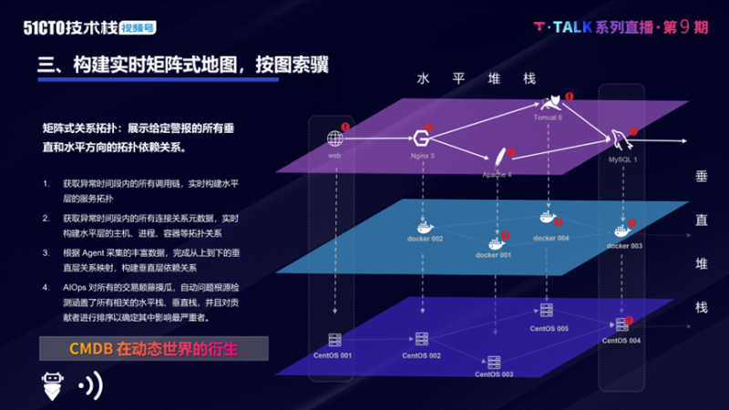 内生AIOps平台能够构建实时矩阵式的拓扑。能够按图索骥,看到图纸当中水平方向,比如服务层的依赖关系图,还有容器层、主机层、进程级等。垂直向则是服务是跑在什么容器上,这个容器对应的是哪一个进程,这个进程是落在哪一个云主机上面。