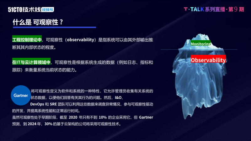 传统的监控的技术和工具很难跟踪当前的越来越多的分布式架构中的通信路径和依赖关系,在云原生的场景或者在云端的场景,依赖关系非常复杂,不再像传统很多的单体架构的应用一样。而可观察性能够更好地控制复杂系统,通过可观察性三大数据支柱能够非常直观详细地了解到复杂系统的方方面面。