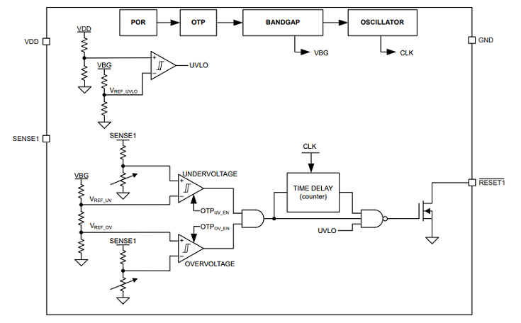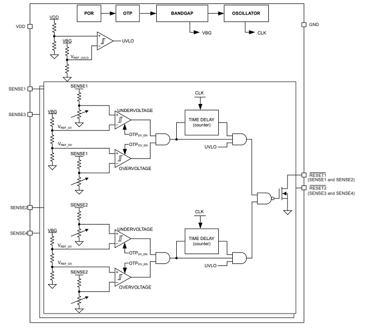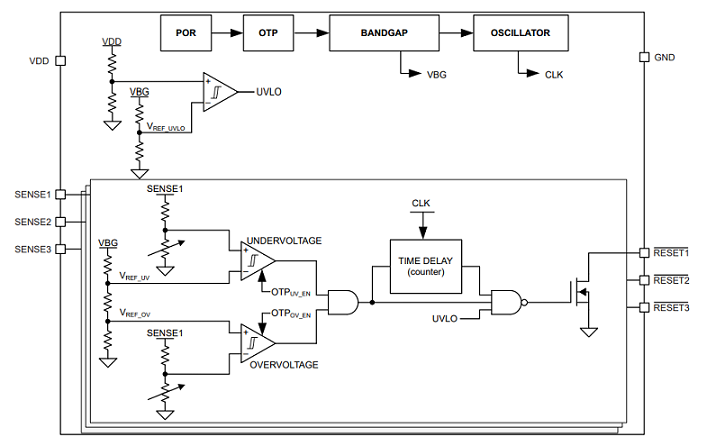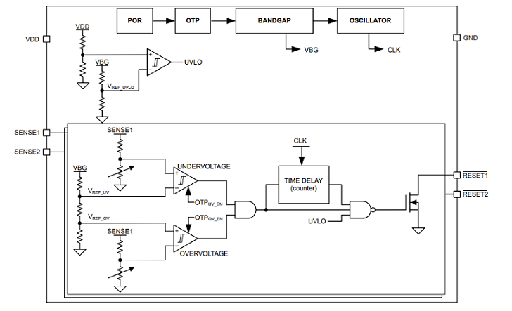 特征:按钮、复位时间延迟、独立的 VDD 和检测、欠压和过压监控器