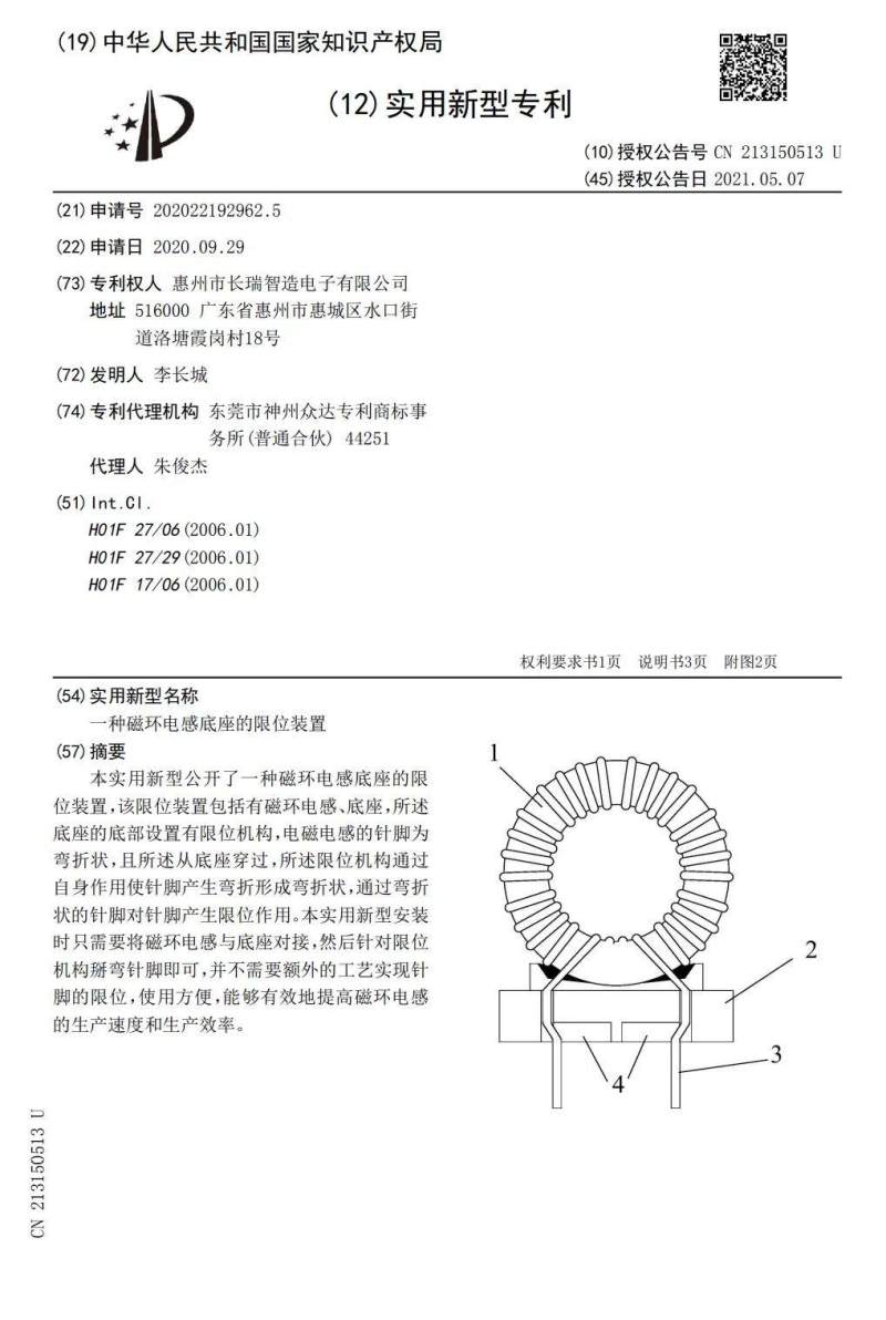 即使研发道路困难重重,长瑞智造最终通过改变传统磁环共模电感直脚形态,实现用限位固定设计替代了传统的点胶固定,于2021年5月获得了实用新型专利。