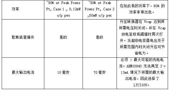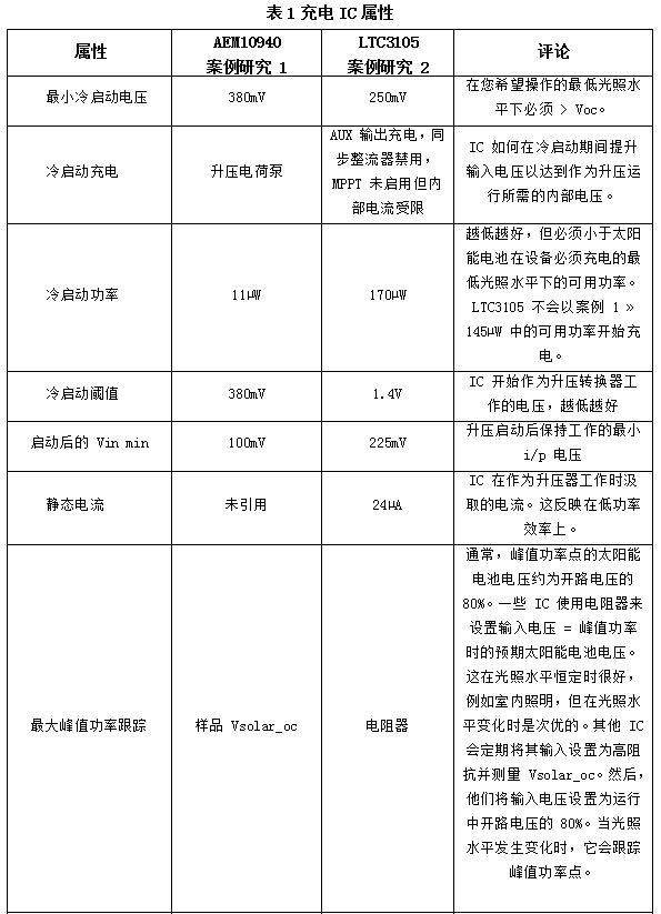 选择太阳能电池阵列配置和充电 IC 应作为一个系统设计一起完成。太阳能电池阵列配置:串联多少个电池,多少个并联串,将决定 Vsolar_oc,以及在低光照水平下可用的电压和电流。如果 Vsolar_oc > Vload 并且低光照水平下的太阳能电池电压 < Vload,则降压-升压是合适的。为了简化设计并仅使用升压,配置太阳能电池阵列,使 Vsolar_oc < Vload。要获得所需的功率,请并联使用多个太阳能电池串。KXOB22-4X3L 是由 3 个串联电池组成的阵列,我们在两个案例研究中并行使用了其中的 5 个。显示 Vsolar_oc 在室内照明中约为 1.2V,在室外照明中约为 1.8V,因此这种配置在两种情况下都需要升压转换器。对于室内情况,我们选择了 e-peas 的 AEM10940-QFN24,对于室外情况,我们选择了 LTC3105 . 表 1列出了选择充电 IC 时考虑的属性。