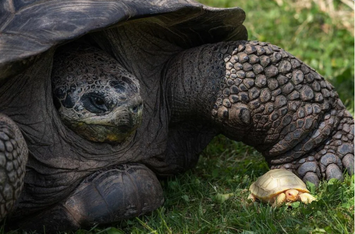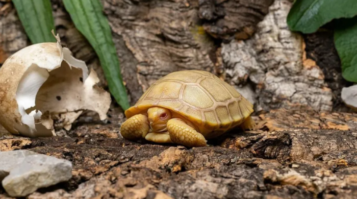 这只白化幼龟是两只新出生的幼龟之一。另一个是黑色的,像它的父母。Tropiquarium说,白化病在龟类中极为罕见,此前在野外的加拉帕戈斯巨龟中还没有被观察到。