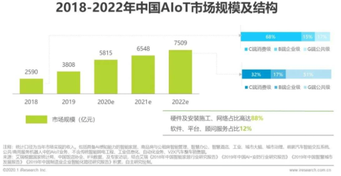 当碎片化与智能化应用并驾齐驱成为常态,多元场景的AIOT融合方案将牢牢占领企业与用户的心智。“AI+”智慧交通、新零售、智能家居、AI医疗、智能工业、智慧安防、金融等诸多领域形成了AIOT的广阔市场。2019年我国AIOT应用市场规模达3031亿元人民币,得益于5G等新技术规划化商用和AIOT在公共事业、消费等领域的大规模落地,预计AIOT产业在2022年突破7500亿元,实现52%的高速增长。
