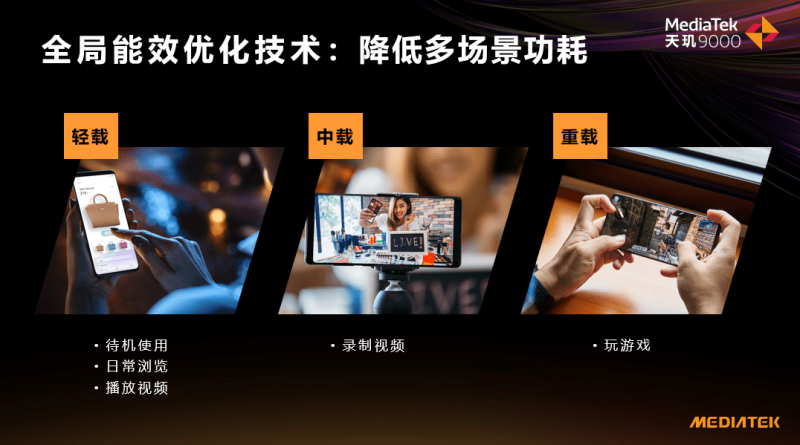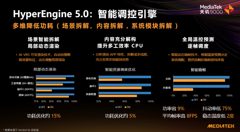 另一方面,天玑9000支持联发科全局能效优化技术,可全面覆盖不同IP模块,根据轻载、中载、重载等不同场景采用针对的能效优化模式,优化全场景功耗,最终达成整机的高能效表现。