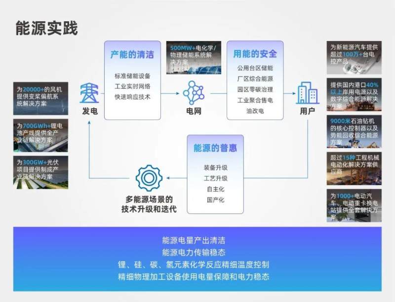 为服务新能源高质量发展,汇川技术一直致力于通过装备升级、工艺升级、自主化、国产化,帮助新能源企业在上游实现发电成本的降低。此外,汇川技术在源、网、荷、储领域积极布局,将电力电子的控制技术与数字化结合,构建数字化的能源生态。