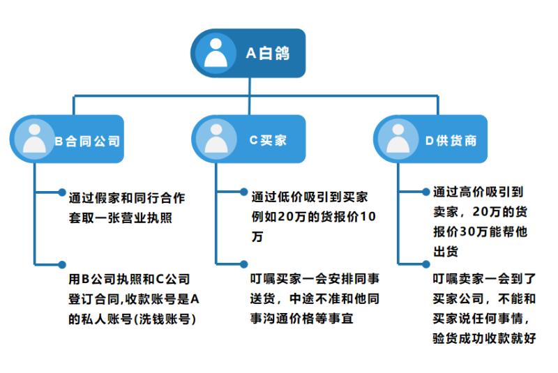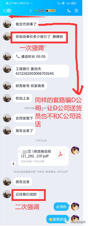 第二步:骗子白鸽找到D公司,以高价出货的诱惑找到D,让D在没有收任何定金的情况下送货到C公司,交待验货成功后付款(这里面有个细节,A是骗子,不会出面,正常D和C见面是要沟通的,为防止骗局串帮,A忽悠D,我帮你找到可观的价格买你货的人,见面了你什么话都不能说,不能跳我单,验货成功后,你只管拿走你那份钱就好了)收到钱后,要私下返多少钱给到A,导致D会听从骗子白鸽的安排。