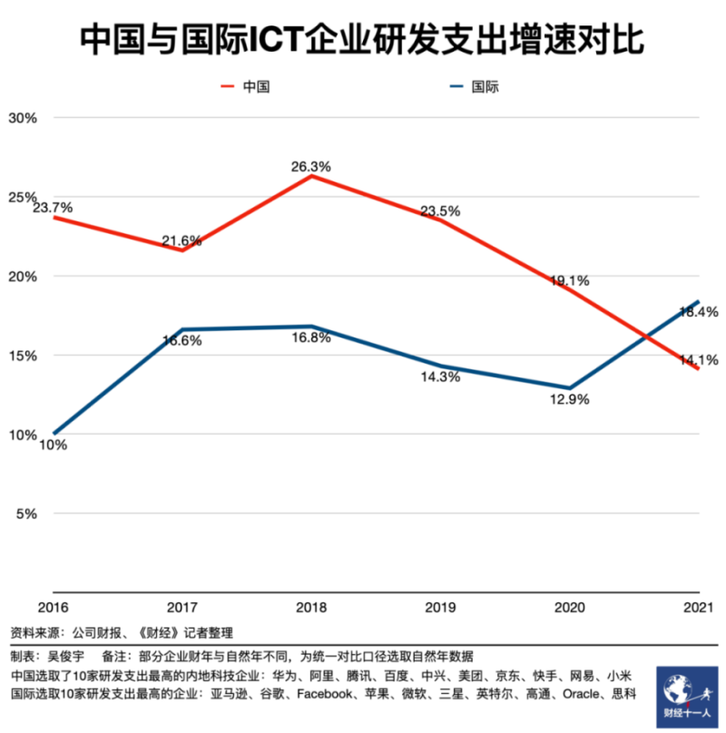 虽然从各家财报来看,尤其是华为、阿里、腾讯等头部大厂近年研发支出持续上升,但从增速来看,根据财经杂志整理对比,华为、阿里、腾讯、百度、中兴、美团、京东、快手、网易、小米10家企业研发支出总额增速逐年下滑,但国际企业研发支出增速呈上升趋势,2021年增长至18.4%。